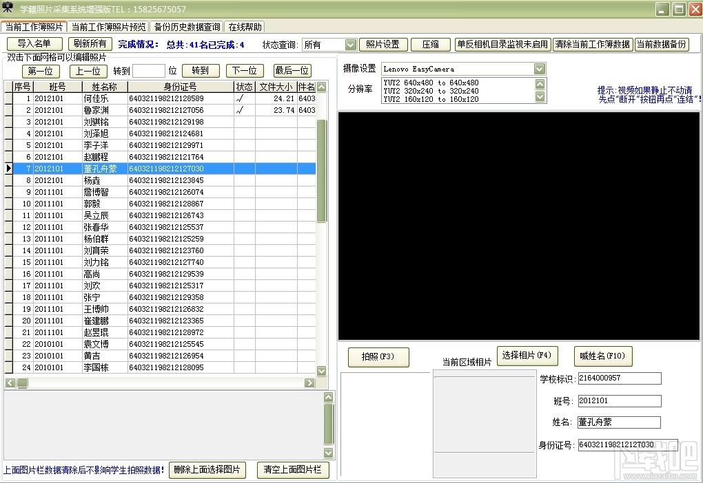增强版支持:相机拍照功能,喊学生姓名功能,支持导入教育部下发的:学生学籍模板.xls超强的照片编辑,查询预览功能。