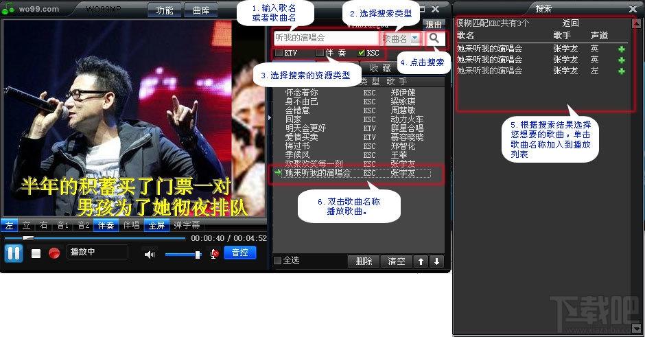 1.50万首优质带歌词立体声原版伴奏2.9万首高品质KSC伴奏以及歌词3.在线收藏夹功能,无论何时何地轻松调出自己的伴奏4.伴奏播放历史记录功能5.在线播放的同时自动下载到您指定的目录6.多进程高速下载模式,以最快的速度完成伴奏下载7.各种伴奏以及歌手排行,让您及时了解新最热的伴奏8.更加人性化地音轨切换功能9.适合家庭K歌、网络K歌。