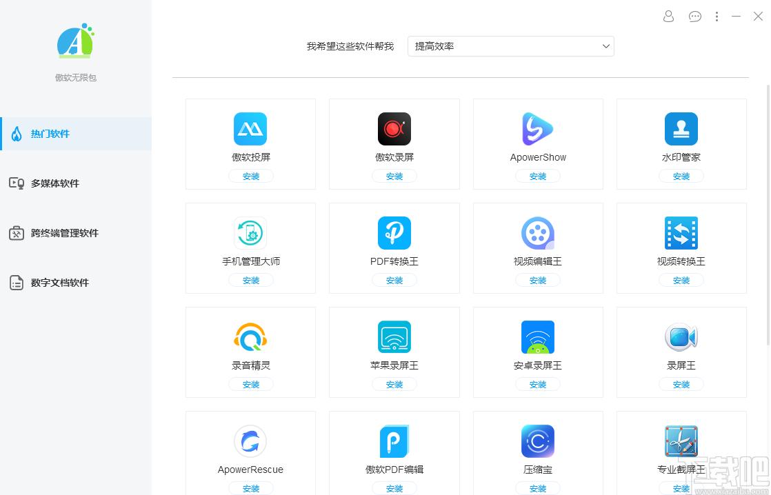 傲软无限包是一款功能强大、方便好用的软件盒子类软件,该软件包含了软件旗下所有产品,例如傲软投屏傲软录屏、视频编辑王等,通过该软件用户可以快速进行各种软件下载进行使用;傲软无限包这款软件下载软件支持傲软热门软件下载、多媒体软件下载、数字文档软件类软件下载等,通过该软件用户可以随意下载使用傲软旗下的所有软件;有了这个软件盒子,用户几乎不用下载其他工具即可满足用户日常所用文件处理、文档管理、视频转换等操作,非常方便好用,有需要的用户可以下载进行使用。